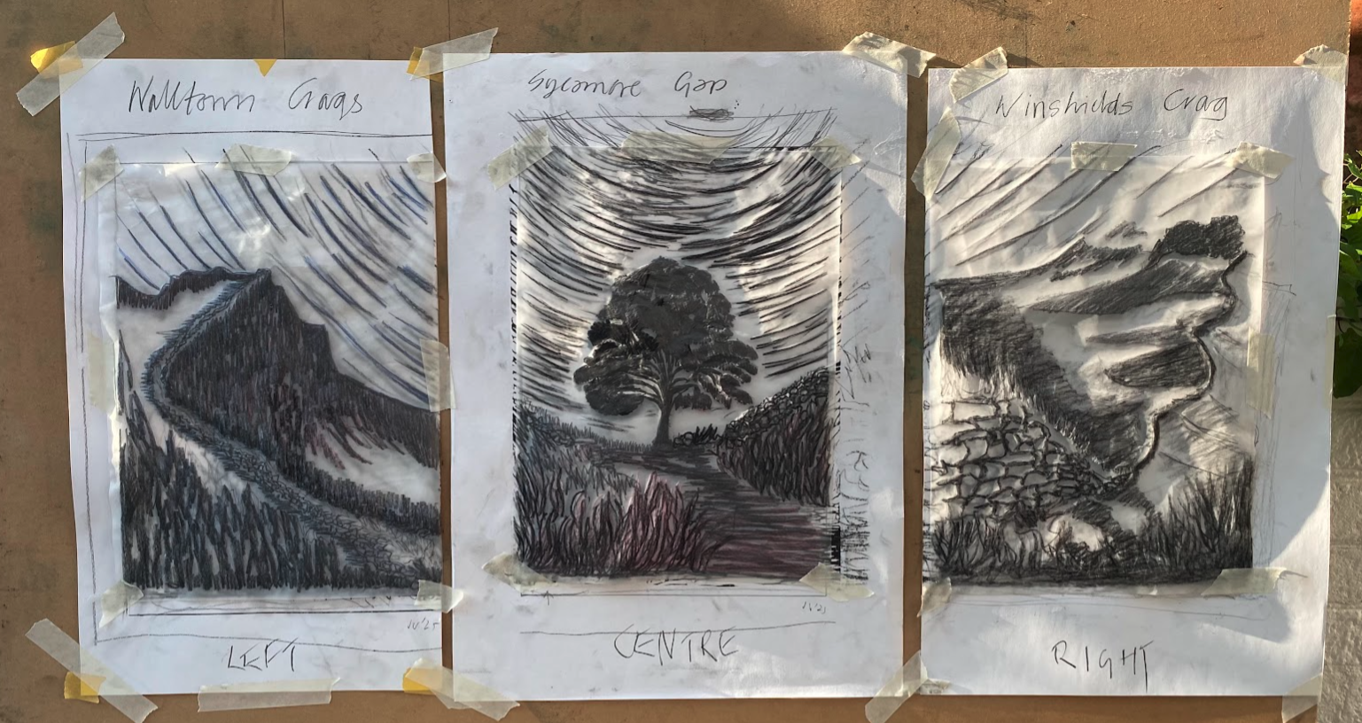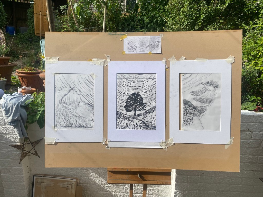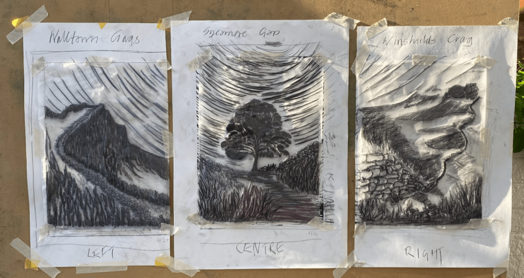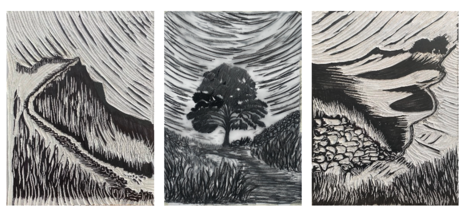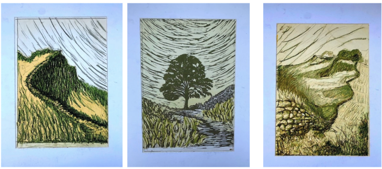 This new set of three relief prints began as a simple idea: to create companion pieces to my earlier Sycamore Gap print. I wanted to explore other views along Hadrian’s Wall — perspectives that would complement that iconic scene while standing on their own.