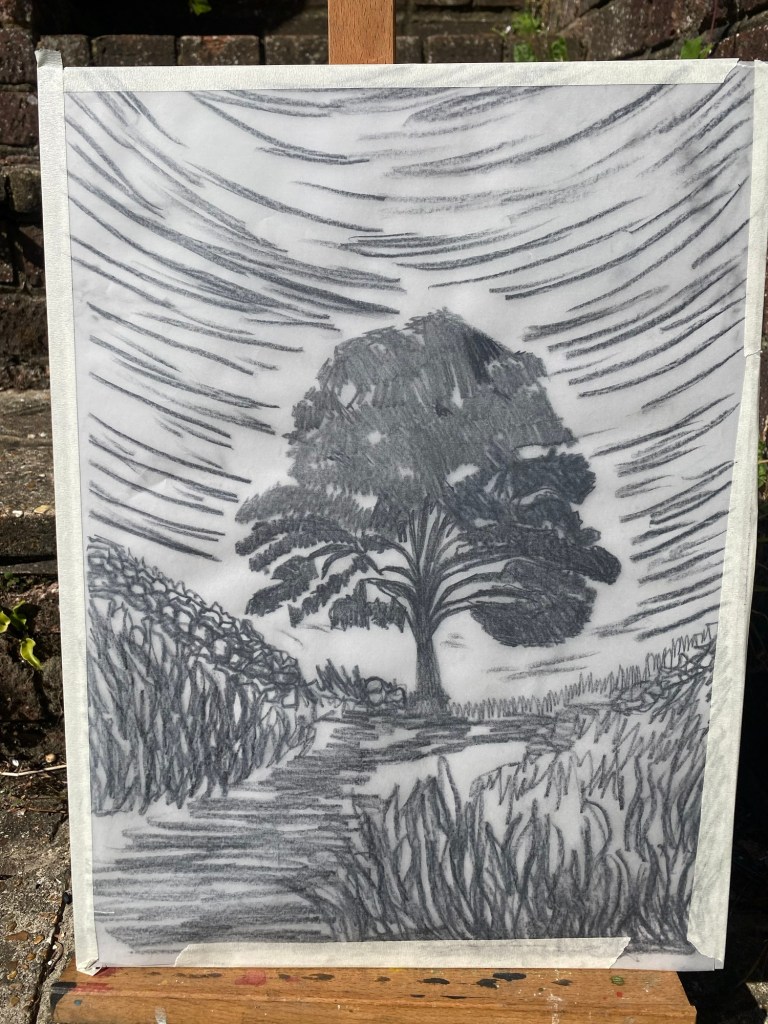 Once etched onto the Lino block by marking over these pencil drawings (always 6B soft pencils or charcoal pencils) I was intrigued by the impression made on the tracing paper, which in the low evening sun gave a 3D effect across the drawing board.