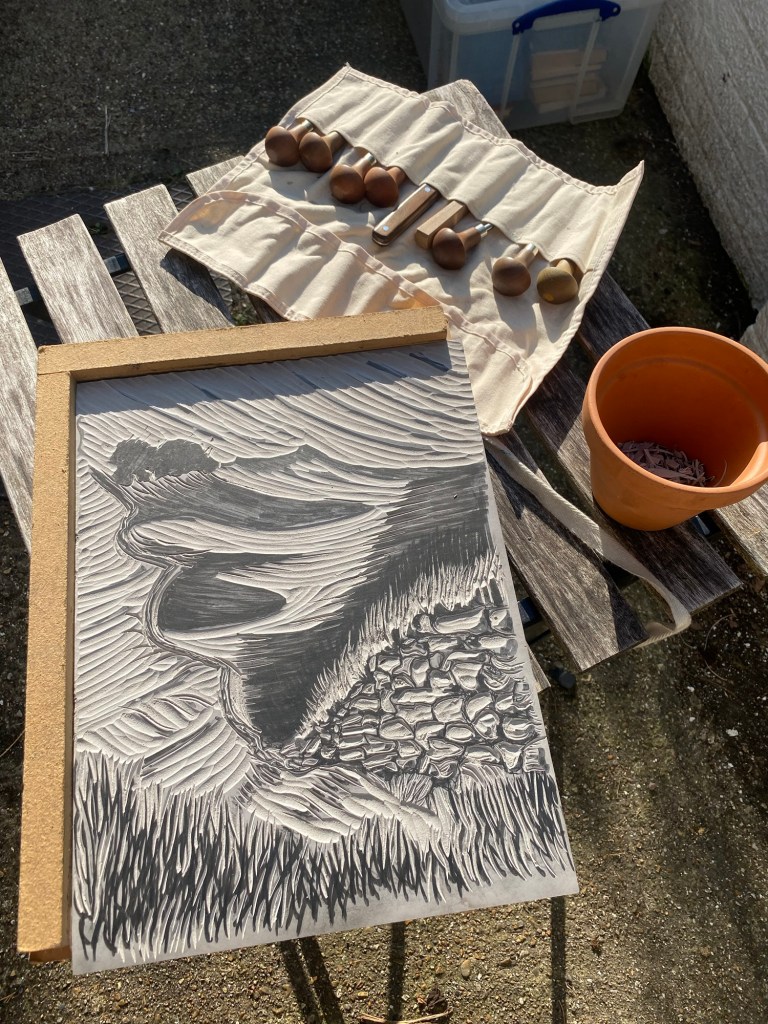 From here, the plan is to fine-tune the carving, explore colour layers, and print onto archival paper. I’m also editing a short 30-second video showing the whole process — from first sketch to finished print — which I’ll share soon across Facebook and Instagram.