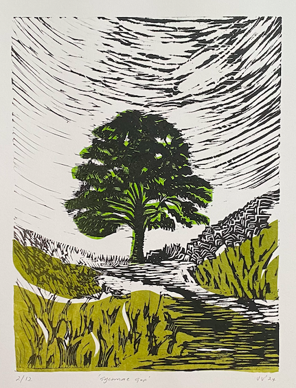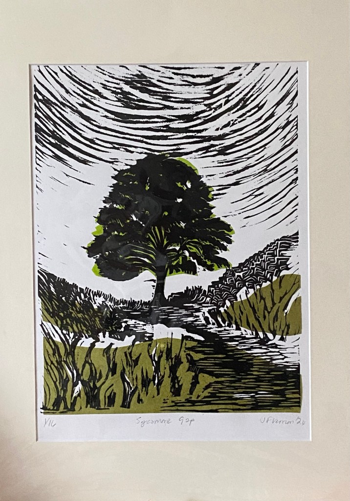 In my quest for reference photos, I turned to my sister, who lives in Northumberland. She took pictures during a family gathering in July 2019. These images have inspired a new series of hand-printed A3 chine collée lino prints, capturing the essence of the Sycamore Gap tree.